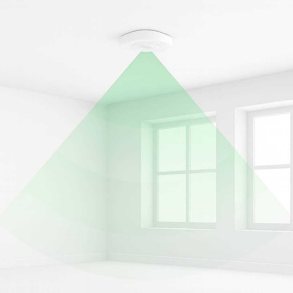 Ensure the sensor’s view is not blocked by furniture or open doors. In smaller or enclosed rooms, mount the sensor in the centre of the ceiling to achieve full coverage.